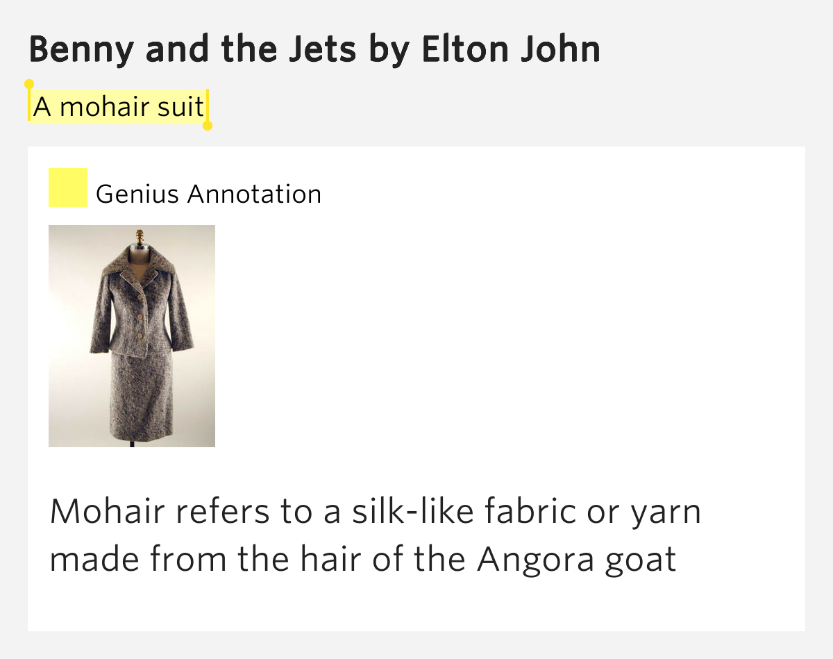 What movie is the song benny and the jets from? Bennie and the jets lyrics: What does the song bennie and the jets mean? chorus she's got electric boots, a mohair suit. Hey kids, shake it loose together / the spotlight's hitting something / that's been known to change the weather / we'll kill the fatted calf tonight / so stick around.
